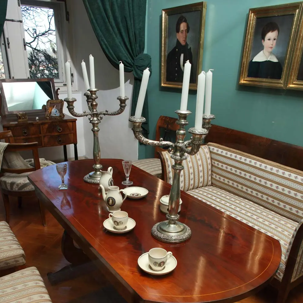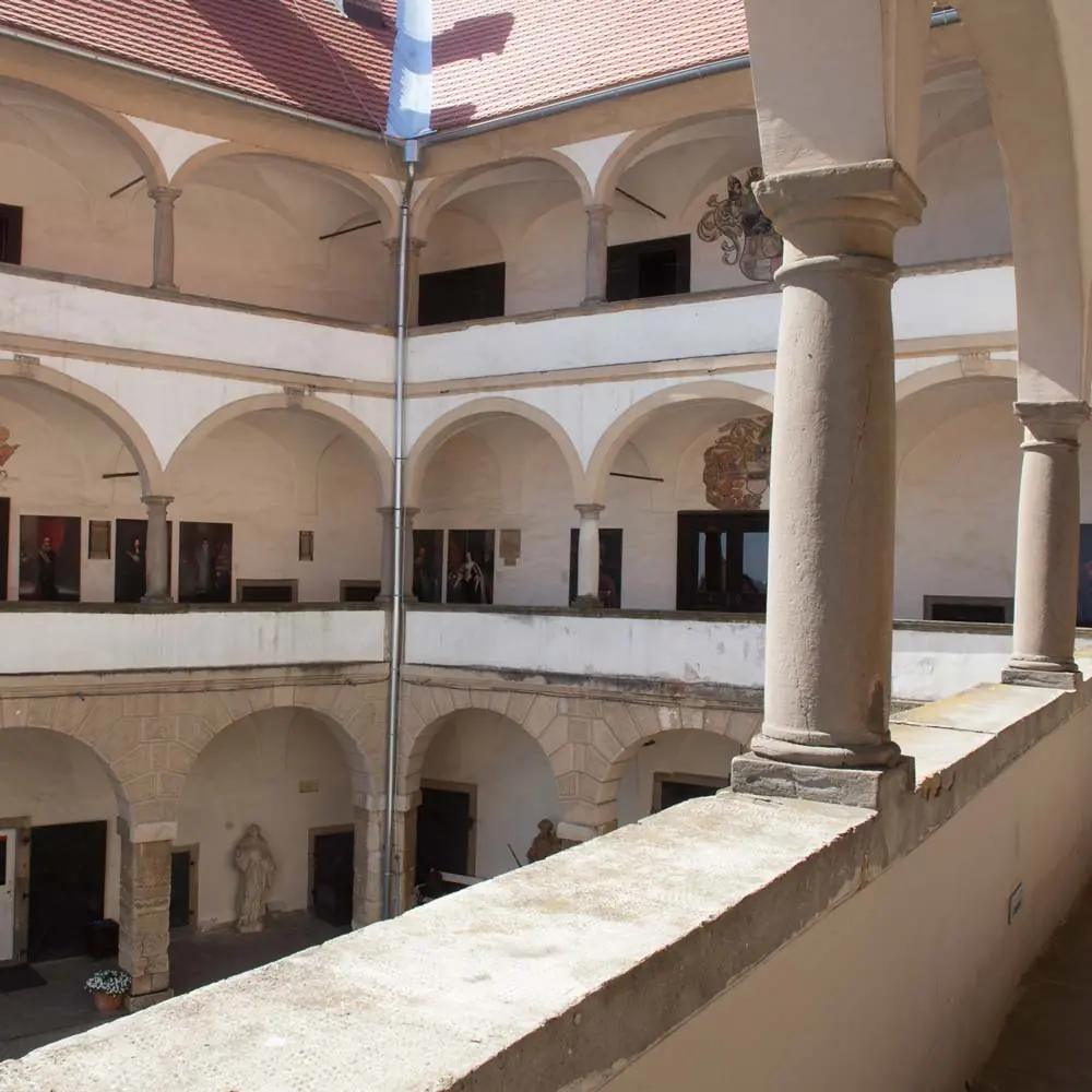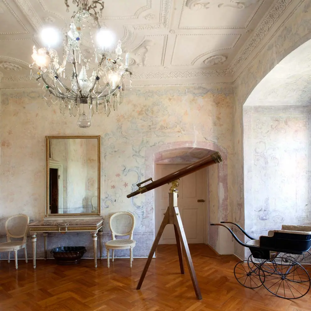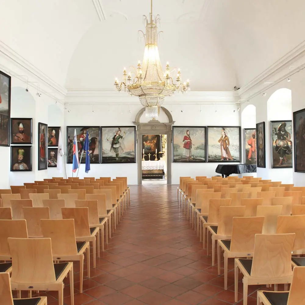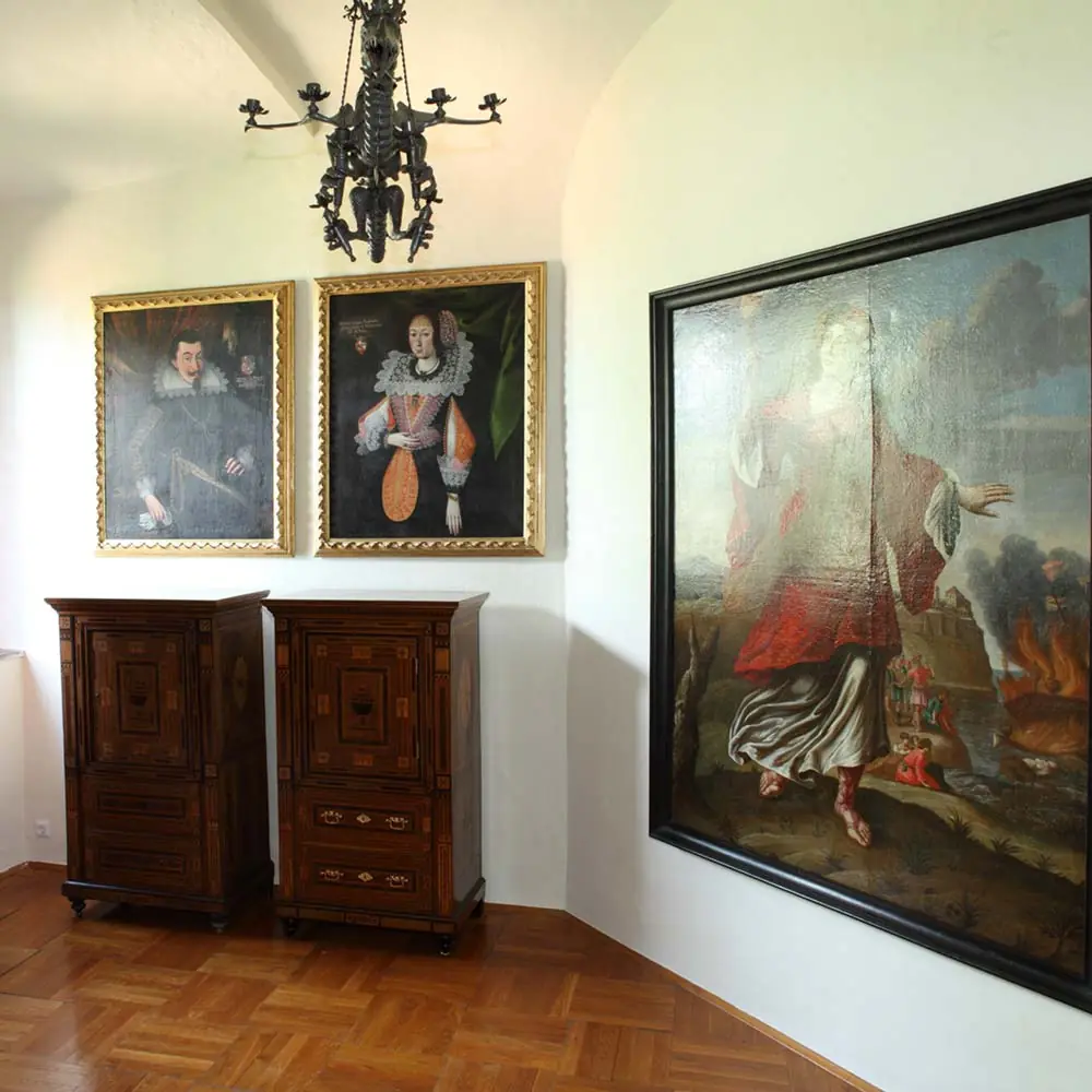 Bis zum Ende des 17. Jahrhunderts befand sich hier eine Kapelle, wovon die reich verzierte Decke mit der ältesten bewahrten Stuckatur der Burg zeugt. In den siebziger Jahren des 18. Jahrhunderts haben die Grafen Leslie den Raum mit dekorativer Rokokomalerei gestalten lassen. Das kupferne Weingefäß ist aus dem 17., das Teleskop und der Kinderwagen aus … Weiterlesen …