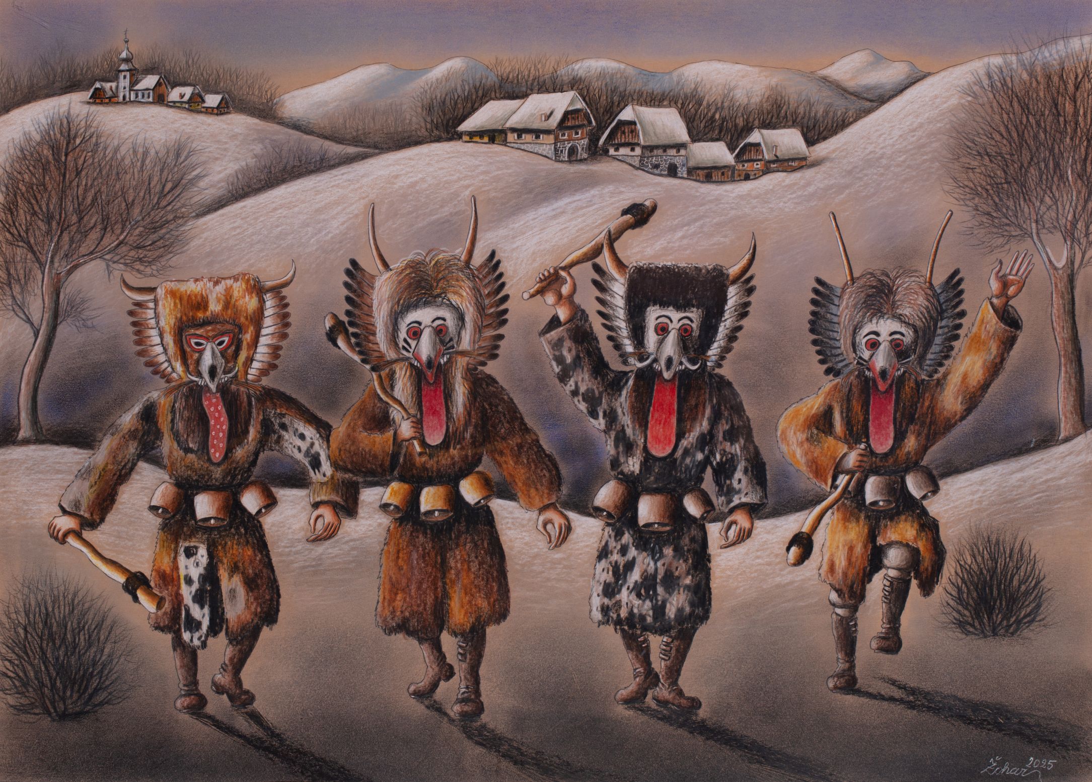 For Boris Žohar, the figure of the kurent and its ancient and mysterious mission in the world of mask culture have always been an inexhaustible motif and artistic inspiration for his artistic creation. The exhibition features his latest painting opus on the theme of the kurent and similar carnival masks from Slovenia and Europe, created in 2025 and will be exhibited for the first time at the Mihelič Gallery.
